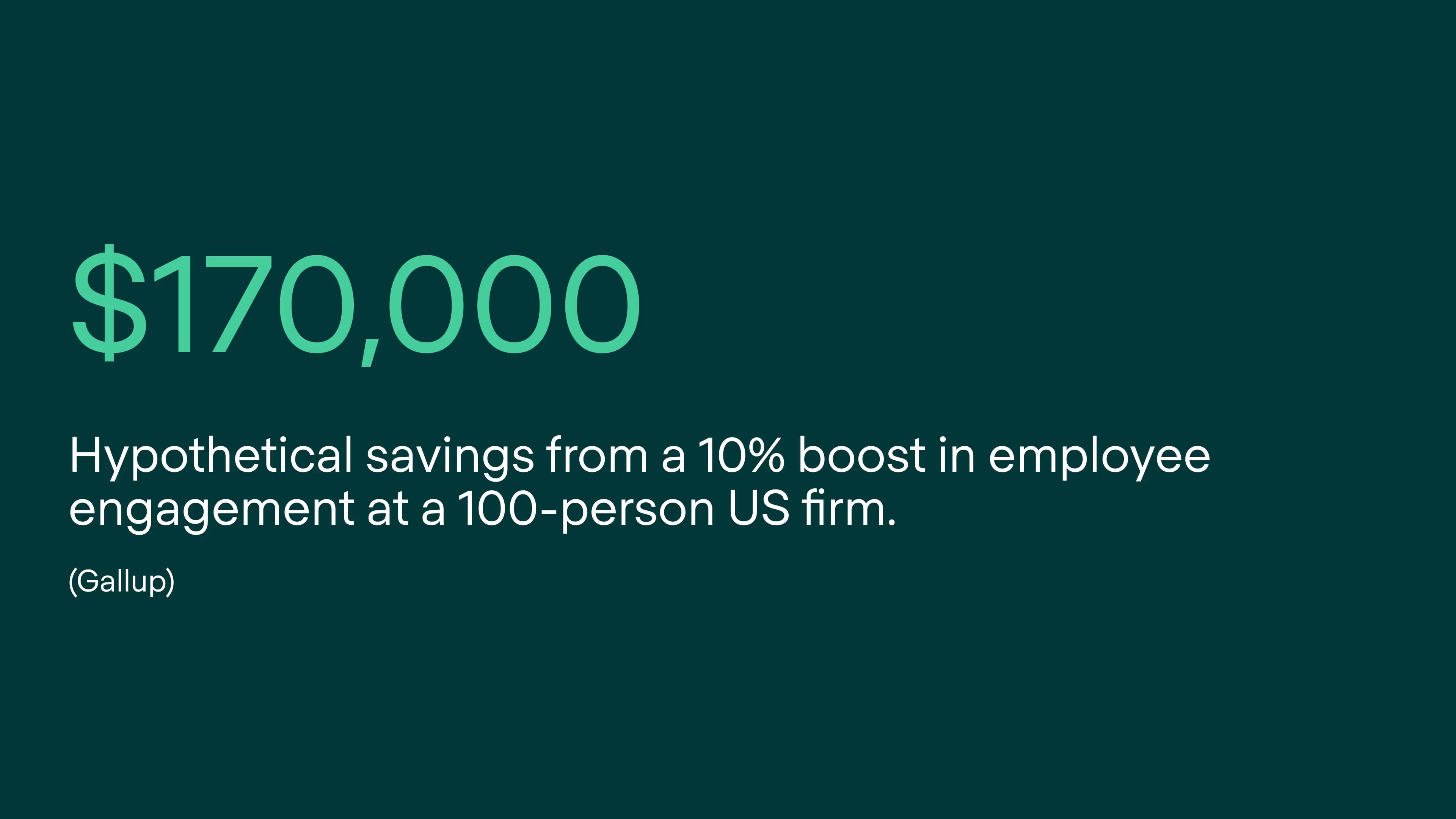 You lead a small business that employs around 100 people. Based on Gallup’s survey of US workers in 2023, which states that only 33% of employees are engaged, we can calculate that around 67 of those 100 employees are disengaged and complacent in their work, and that the average salary of those employees is $50,000. That means your employee complacency is costing you $1,139,000 a year.
