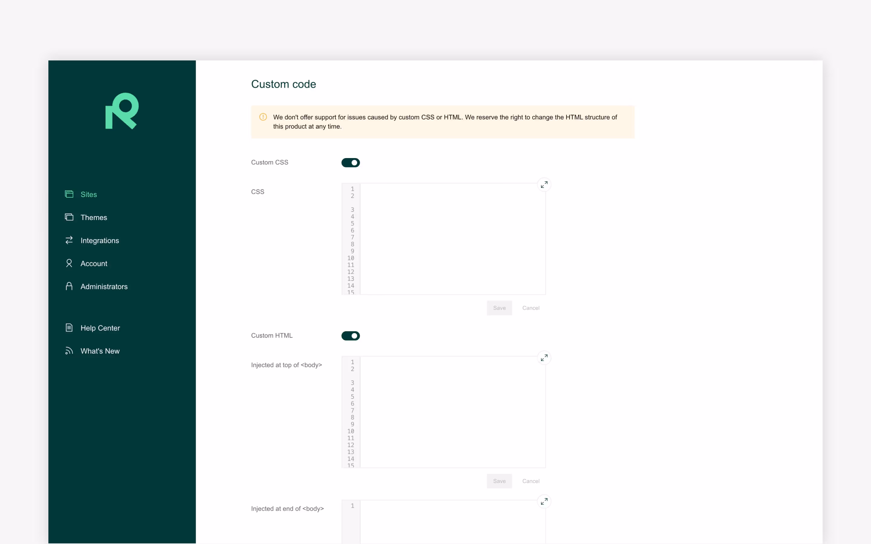 To integrate an external service with a Refined site, activate custom HTML on your site. The only requirement is that the service you’re integrating has a widget. Note that any code you add here will apply the widget site-wide (see below if you only want the widget to appear only on certain pages).