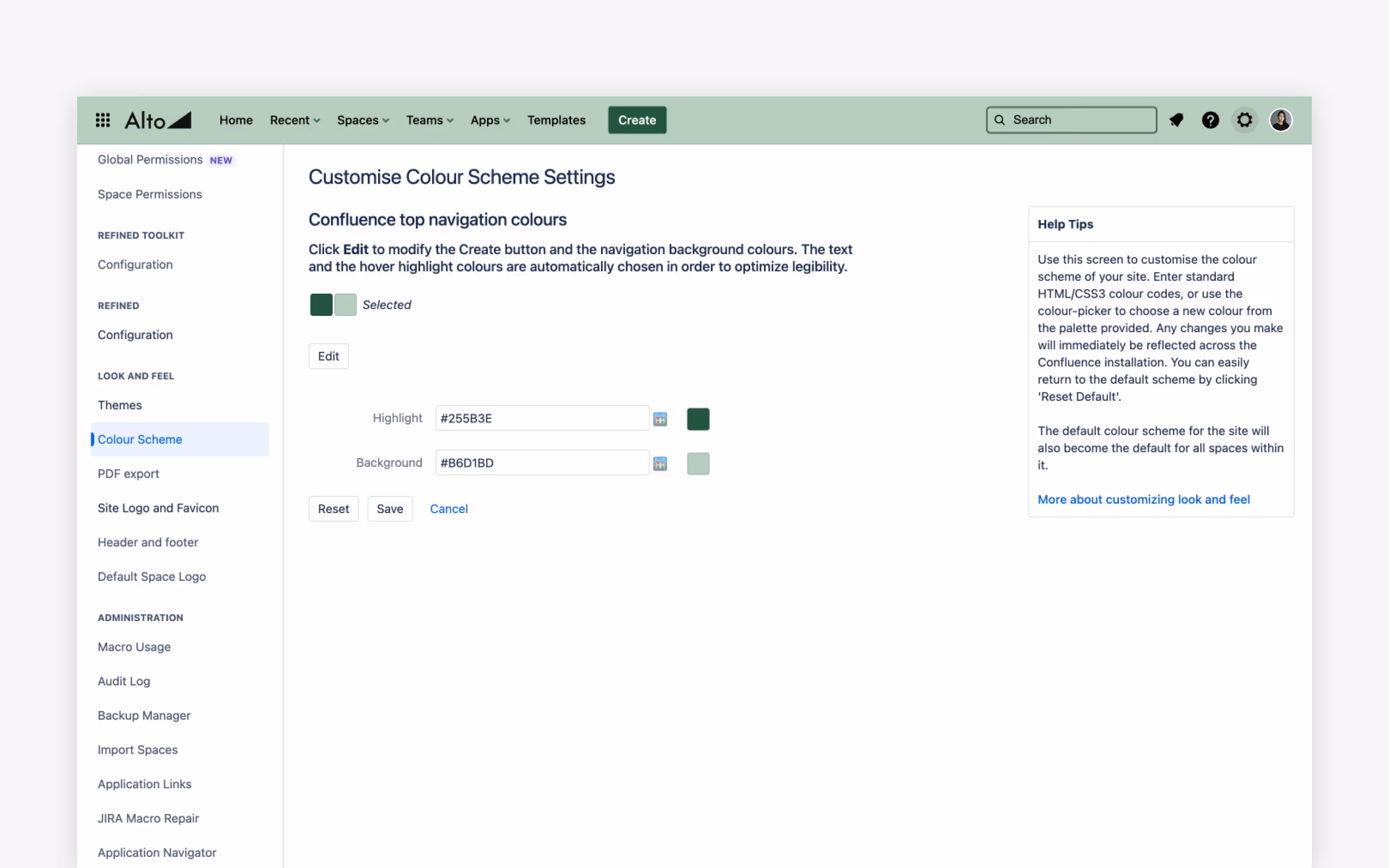 Refined Toolkit for Confluence Cloud offers theming capabilities on a smaller scale, allowing you to theme spaces and customize landing pages with a Page Builder and a suite of macros.