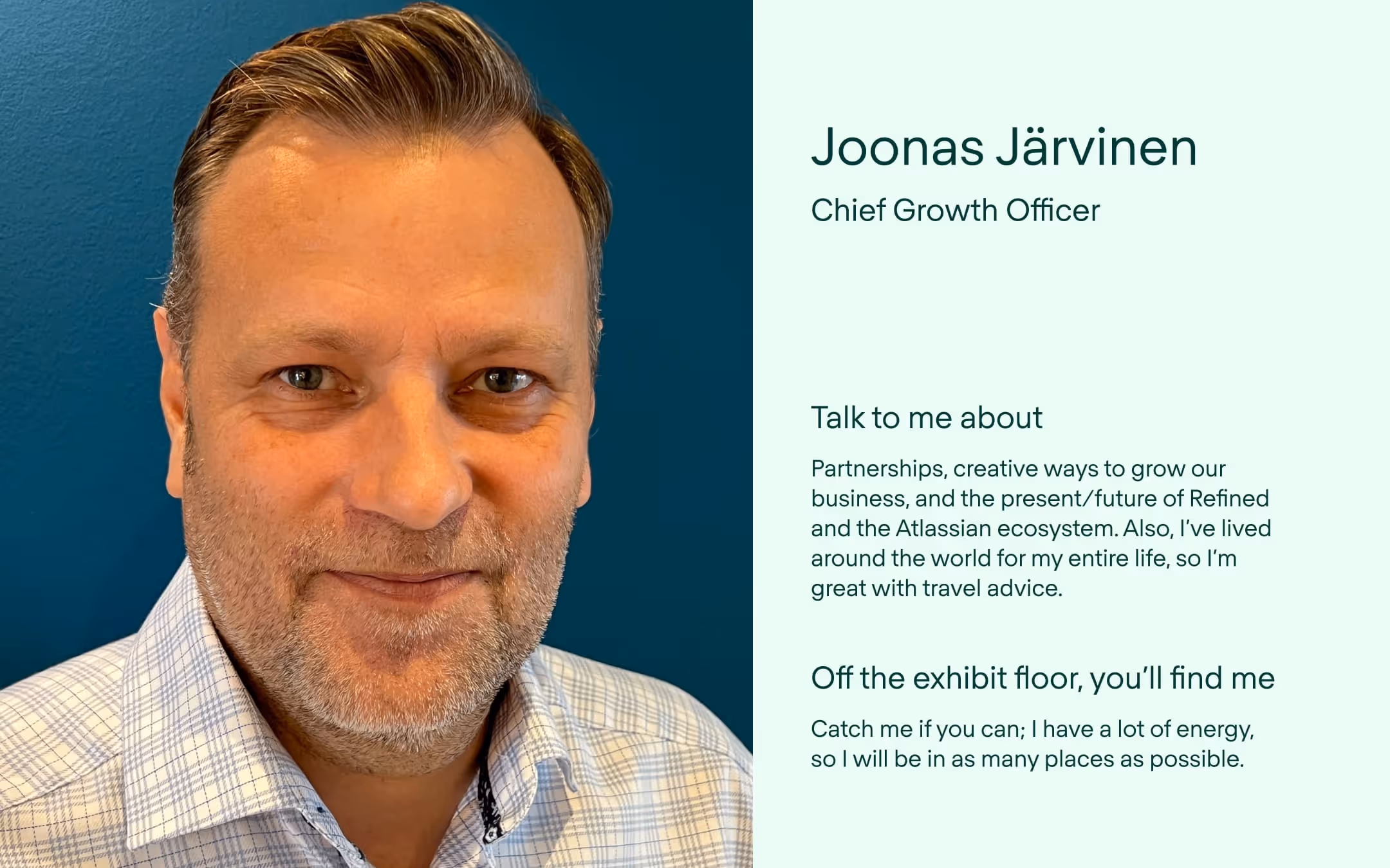 So, in a bid to get you to come by booth #8 (right next to the Atlassian hub—can’t miss us) to say hi, grab some swag, and get a quick demo of Refined, we’ve compiled what you need to know about who’s staffing our booth, including what they do at Refined and what they're up to off the exhibit floor.