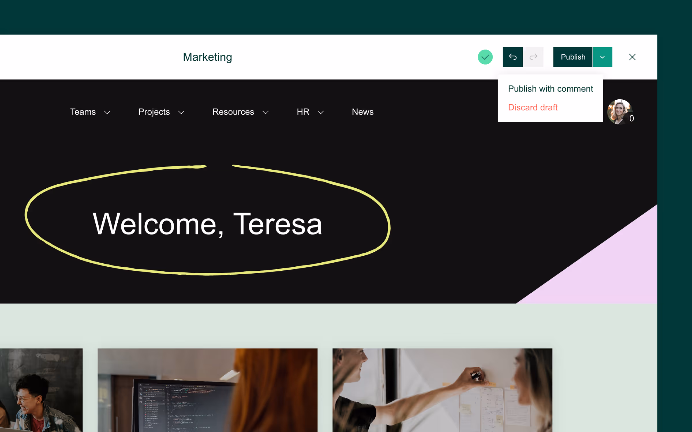 While writing, hit $ to see how you can personalize your text. For example, the text variable $username allows you to personally welcome a user to your intranet.