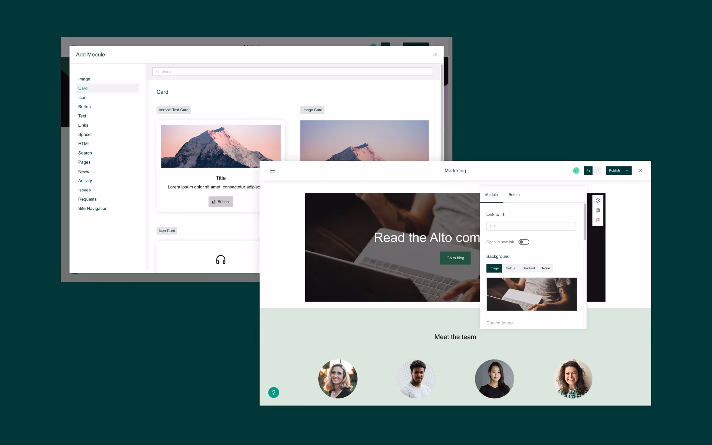 Backgrounds on sections and modules allow you to apply colors and photos to your site in new ways. You can set one background for the whole page, alternating backgrounds on rows, or even apply backgrounds to individual modules.