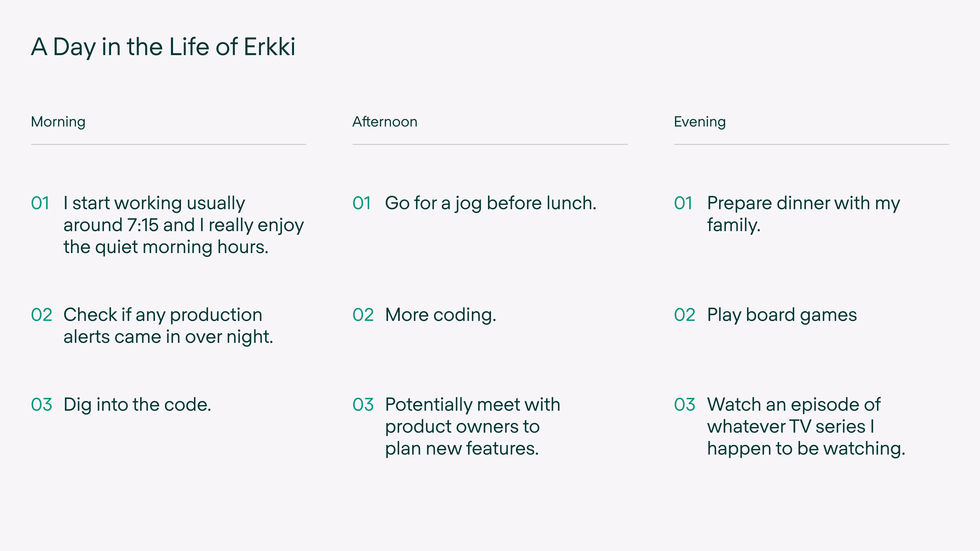 What I actually do: Write code, plan upcoming features with the Product Owner, help other team members.